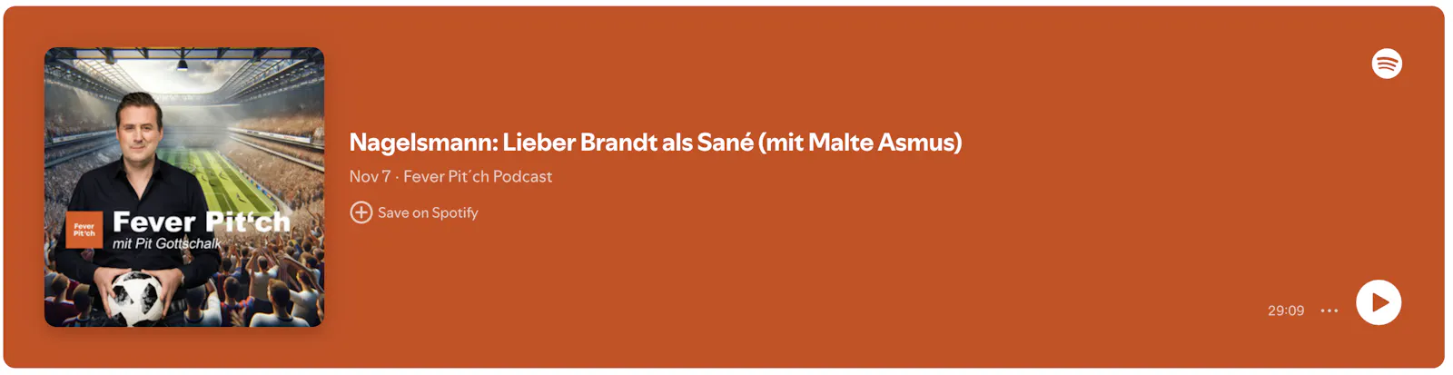 Mit seiner Kader-Nominierung für die zwei Länderspiele gegen Bosnien-Herzegowina und Ungarn hat Bundestrainer Julian Nagelsmann überrascht: Er holte Julian Brandt von Borussia Dortmund zurück in die Nationalmannschaft und verzichtete erneut auf Leroy Sané von Bayern München. Die Cause Sané: Nur eine Vorsichtsmaßnahme - oder doch eine versteckte Botschaft wie bei Leon Goretzka, dass die Zeit beim DFB ausläuft? Darüber diskutieren Pit Gottschalk und Malte Asmus im Fever Pit'ch Podcast (Öffnet in neuem Fenster). Zum Podcast: Hier klicken! (Öffnet in neuem Fenster)